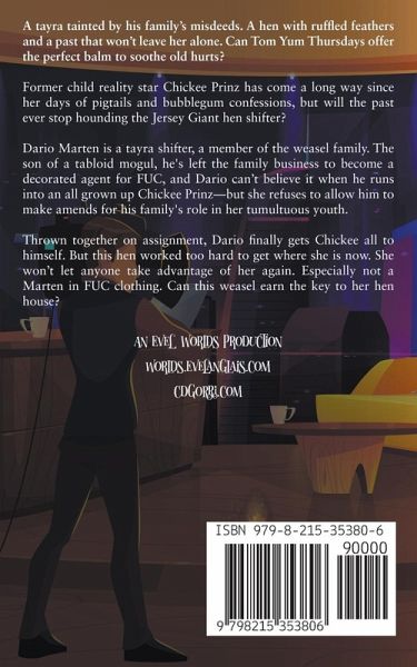 A tayra tainted by his family's misdeeds. A hen with ruffled feathers and a past that won't leave her alone. Can Tom Yum Thursdays offer the perfect balm to soothe old hurts? Former child reality star Chickee Prinz has come a long way since her days of pigtails and bubblegum confessions, but will the past ever stop hounding the Jersey Giant hen shifter? Working at FUCN'A as a guest professor is a step on her path to becoming a real life FUC agent, and nothing is going to get in this determined chick's way. She was finally working on something she could be proud of. Unlike Hatched, the exploitative documentary series responsible for ruining every event of her youth—and she meant every event. Nothing was sacred from the media feeding frenzy that comprised her childhood. Every pimple, wart, ugly cry, period leak, and devastating rejection from boys her age was all recorded for posterity to her unending shame. But outrunning her past is difficult for a chicken-legged shifter. Dario Marten is a tayra shifter, a member of the weasel family—and isn't that apt? He might be the son of a tabloid mogul, but this mindful mustelid has left the family business, becoming a decorated agent for the Furry United Coalition instead. Back at the Academy to brush up on his undercover skills, Dario can't believe Chickee Prinz is all grown up, She sure looks different from the flat-chested, freckle-faced, sad little girl the whole world knew. Dario wants to make amends, but she just won't listen. Not that he blames her. From what he recalls, Chickee's childhood was a living hell and the Marten family certainly contributed. He really should leave her alone, but there's something about the curvy chick he just can't get enough of. Thrown together on assignment, Dario finally gets Chickee all to himself. But this hen worked too hard to get where she was now. She won't let anyone take advantage of her again. Especially not a Marten in FUC clothing. Can this weasel earn the key to her hen house? Find out in Chickee and the Paparazzi. *Chickee and the Paparazzi by C.D. Gorri is an EveL Worlds paranormal romantic comedy set in Eve Langlais' Furry United Coalition (F.U.C.) World.