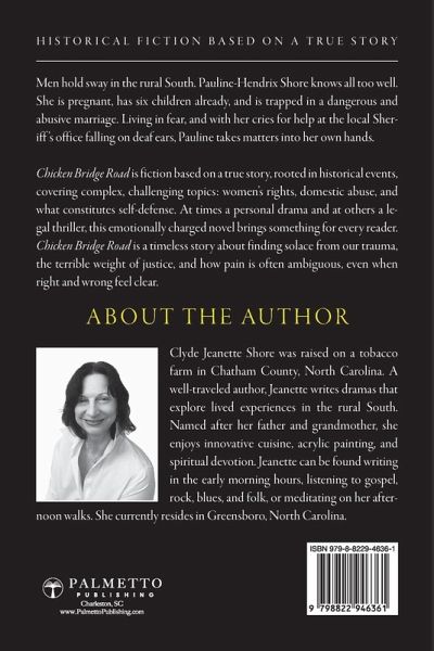 Pauline only wanted love and happiness in her marriage. Instead, she and her six, soon to be seven, children suffered abuse. The choice she's about to make may free them from death-but will it cost her everything else? In the rural South in the mid-twentieth century, men hold sway. Pauline-Hendrix Shore lives with her husband, Clyde, in Pittsboro, North Carolina. Clyde's abuses running rampant, Pauline is running out of options. She reaches out for help with the local Sheriff's office, but her crying pleas fell on deaf ears. With six children to care for and another on the way, Pauline takes matters in her own hands, changing the course of her future forever. When the dust settles, Pauline will make history: one of the only women in North Carolina to fatally shoot a man without being charged with murder. This landmark case, for all its tragedy, will become one of the most important in state history-and in Pauline's own family. Clyde Jeanette Shore spins a masterful tale of her own family's true history that is engaging, poignant, and essential for understanding women's rights in Chatham County. Named for the road that runs by the tobacco farm where she grew up, Chicken Bridge Road is filled with Shore's memories and heritage. For fans of The Color Purple and Bastard out of Carolina, Chicken Bridge Road is a can't-miss drama that centers the focus on women, family, and the true meaning of justice.