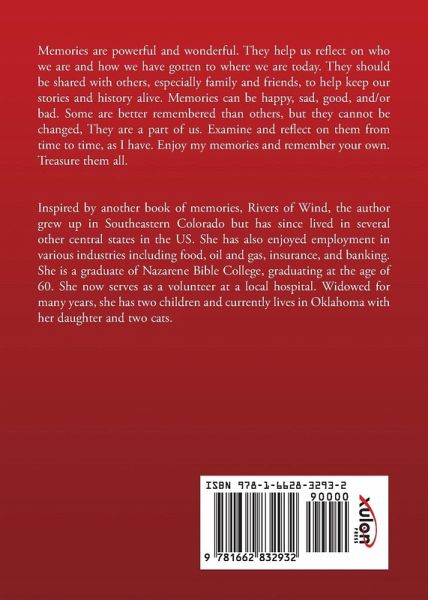 Memories are powerful and wonderful. They help us reflect on who we are and how we have gotten to where we are today. They should be shared with others, especially family and friends, to help keep our stories and history alive. Memories can be happy, sad, good, and/or bad. Some are better remembered than others, but they cannot be changed, They are a part of us. Examine and reflect on them from time to time, as I have. Enjoy my memories and remember your own. Treasure them all. Inspired by another book of memories, Rivers of Wind, the author grew up in Southeastern Colorado but has since lived in several other central states in the US. She has also enjoyed employment in various industries including food, oil and gas, insurance, and banking. She is a graduate of Nazarene Bible College, graduating at the age of 60. She now serves as a volunteer at a local hospital. Widowed for many years, she has two children and currently lives in Oklahoma with her daughter and two cats.