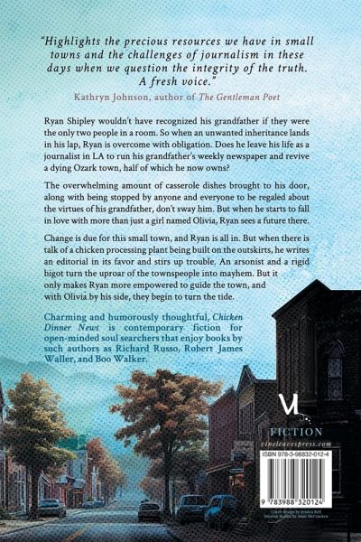 Ryan Shipley wouldn't have recognized his grandfather if they were the only two people in a room. So when an unwanted inheritance lands in his lap, Ryan is overcome with obligation. Does he leave his life as a journalist in LA to run his grandfather's weekly newspaper and revive a dying Ozark town, half of which he now owns? The overwhelming amount of casserole dishes brought to his door, along with being stopped by anyone and everyone to be regaled about the virtues of his grandfather, don't sway him. But when he starts to fall in love with more than just a girl named Olivia, Ryan sees a future there. Change is due for this small town, and Ryan is all in. But when there is talk of a chicken processing plant being built on the outskirts, he writes an editorial in its favor and stirs up trouble. An arsonist and a rigid bigot turn the uproar of the townspeople into mayhem. But it only makes Ryan more empowered to guide the town, and with Olivia by his side, they begin to turn the tide. Charming and humorously thoughtful, Chicken Dinner News is contemporary fiction for open-minded soul searchers that enjoy books by such authors as Richard Russo, Robert James Waller, and Boo Walker.