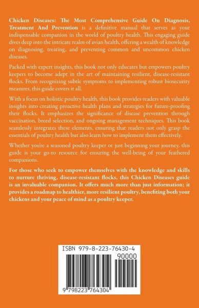 Chicken Diseases: The Most Comprehensive Guide On Diagnosis, Treatment And Prevention is a definitive manual that serves as your indispensable companion in the world of poultry health. This engaging guide dives deep into the intricate realm of avian health, offering a wealth of knowledge on diagnosing, treating, and preventing common and uncommon chicken diseases. Packed with expert insights, this book not only educates but empowers poultry keepers to become adept in the art of maintaining resilient, disease-resistant flocks. From recognizing subtle symptoms to implementing robust biosecurity measures, this guide covers it all. With a focus on holistic poultry health, this book provides readers with valuable insights into creating proactive health plans and strategies for future-proofing their flocks. It emphasizes the significance of disease prevention through vaccination, breed selection, and ongoing management techniques. This book seamlessly integrates these elements, ensuring that readers not only grasp the essentials of poultry health but also learn how to implement them effectively. Whether you're a seasoned poultry keeper or just beginning your journey, this guide is your go-to resource for ensuring the well-being of your feathered companions. For those who seek to empower themselves with the knowledge and skills to nurture thriving, disease-resistant flocks, this Chicken Diseases guide is an invaluable companion. It offers much more than just information; it provides a roadmap to healthier, more resilient poultry, benefiting both your chickens and your peace of mind as a poultry keeper.