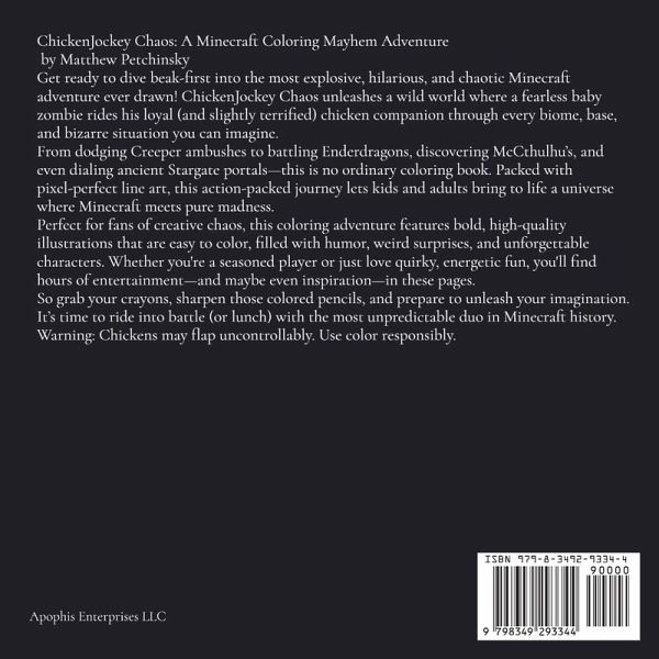 ChickenJockey Chaos: A Minecraft Coloring Mayhem Adventure by Matthew Petchinsky Get ready to dive beak-first into the most explosive, hilarious, and chaotic Minecraft adventure ever drawn! ChickenJockey Chaos unleashes a wild world where a fearless baby zombie rides his loyal (and slightly terrified) chicken companion through every biome, base, and bizarre situation you can imagine. From dodging Creeper ambushes to battling Enderdragons, discovering McCthulhu's, and even dialing ancient Stargate portals-this is no ordinary coloring book. Packed with pixel-perfect line art, this action-packed journey lets kids and adults bring to life a universe where Minecraft meets pure madness. Perfect for fans of creative chaos, this coloring adventure features bold, high-quality illustrations that are easy to color, filled with humor, weird surprises, and unforgettable characters. Whether you're a seasoned player or just love quirky, energetic fun, you'll find hours of entertainment-and maybe even inspiration-in these pages. So grab your crayons, sharpen those colored pencils, and prepare to unleash your imagination. It's time to ride into battle (or lunch) with the most unpredictable duo in Minecraft history. Warning: Chickens may flap uncontrollably. Use color responsibly.