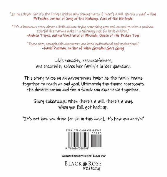 Chickens Don't Ski is a Mom's Choice Awards® Gold Recipient Lily's tenacity, resourcefulness, and creativity solves her family's latest quandary. This story takes on an adventurous twist as the family teams together to reach an end goal. Ultimately the theme represents the determination and fun a family can experience together. Story takeaways: When there's a will, there's a way. When you fall, get back up. "It's not how you drive (or ski in this case), it's how you arrive!"