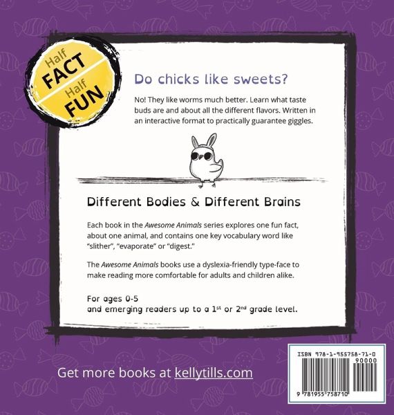 A fun baby chick book for kids ages 0-5Do chicks like sweets? No! They like worms much better. In this light-hearted book, learn what taste buds are and about all the different flavors. Chicks Don't Eat Candy is perfect for home or for classroom read alouds. Kids love shouting out the answers to silly questions like "Can kids taste candy?" This call and response format is a time-tested method for keeping kids engaged and interacting, instead of just chewing on the pages. Fun facts about every kid's favorite farm animal! Excellent for teaching STEM topics about flavor, taste and taste buds. ¿Parents and kids love it. - "Chicks Don't Eat Candy, what about little kids? This is a book that's both cute and funny. The pages are extremely colourful, the artwork are simple, that will appeal to very young readers." - "I look forward to using this book during preschool storytime and anticipate my library purchasing all the titles in this series." - "I LOVE this book. The drawings! So cute! I want to hug the little chick..." ¿Book 6 of 6 in the Awesome Animals Series Other books in the series:Snakes Have No Legs Pigs Never Sweat Geckos Don't Blink Cows Have No Top Teeth Turtles Have Secret Ears Chicks Don't Eat Candy The Awesome Animals series is a collection of weird but true books for kids about the animal kingdom. Half fact and half fun, each book features an animal which is missing something that we're taught to expect should be there. But these animals don't just thrive despite that absence, they thrive because of it. All books use a dyslexia-friendly type-face. With dyslexia, we often focus on the challenges - difficulty reading. But thanks to the way the dyslexic brain is built, people with dyslexia are often creative, intuitive and highly successful. In other words, those people aren't thriving despite their dyslexic brain, they are thriving because of it. ¿