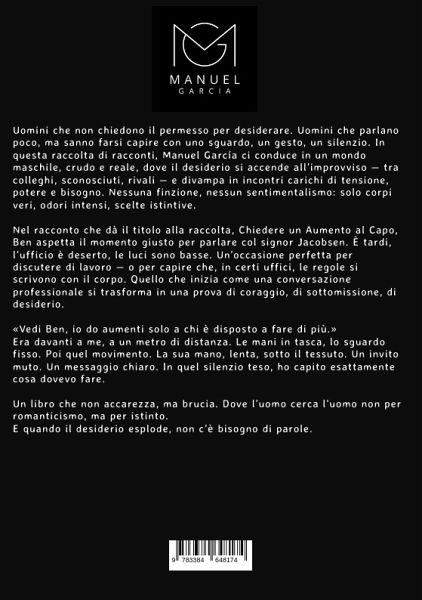 Uomini che non chiedono il permesso per desiderare. Uomini che parlano poco, ma sanno farsi capire con uno sguardo, un gesto, un silenzio. In questa raccolta di racconti, Manuel García ci conduce in un mondo maschile, crudo e reale, dove il desiderio si accende all'improvviso - tra colleghi, sconosciuti, rivali - e divampa in incontri carichi di tensione, potere e bisogno. Nessuna finzione, nessun sentimentalismo: solo corpi veri, odori intensi, scelte istintive.Nel racconto che dà il titolo alla raccolta, Chiedere un Aumento al Capo, Ben aspetta il momento giusto per parlare col signor Jacobsen. È tardi, l'ufficio è deserto, le luci sono basse. Un'occasione perfetta per discutere di lavoro - o per capire che, in certi uffici, le regole si scrivono con il corpo. Quello che inizia come una conversazione professionale si trasforma in una prova di coraggio, di sottomissione, di desiderio.«Vedi Ben, io do aumenti solo a chi è disposto a fare di più.»Era davanti a me, a un metro di distanza. Le mani in tasca, lo sguardo fisso. Poi quel movimento. La sua mano, lenta, sotto il tessuto. Un invito muto. Un messaggio chiaro. In quel silenzio teso, ho capito esattamente cosa dovevo fare.Un libro che non accarezza, ma brucia. Dove l'uomo cerca l'uomo non per romanticismo, ma per istinto.E quando il desiderio esplode, non c'è bisogno di parole.
