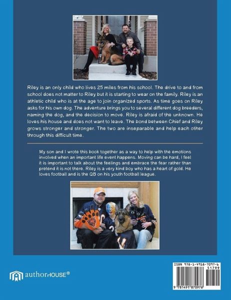 Riley is an only child who lives 25 miles from his school. The drive to and from school does not matter to Riley but it is starting to wear on the family. Riley is an athletic child who is at the age to join organized sports. As time goes on Riley asks for his own dog. The adventure brings you to several different dog breeders, naming the dog, and the decision to move. Riley is afraid of the unknown. He loves his house and does not want to leave. The bond between Chief and Riley grows stronger and stronger. The two are inseparable and help each other through this difficult time.