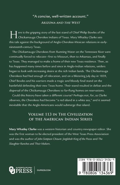Volume 113 in the Civilization of the American Indian Series. Here is the gripping story of the last stand of Chief Philip Bowles of the Chickamauga Cherokee Indians of Texas. Mary Whatley Clarke sets this tale against the stormy background of Anglo-Cherokee-Mexican relations in early nineteenth-century Texas. The Chickamauga Cherokees from Running Water on the Tennessee River were continually forced to relocate-first to Missouri, then to Arkansas, and finally to Texas. They managed to make a home of their new Texas residence. Then, as has happened many times before and since in Anglo-Indian relations, settlers began to look with increasing desire at the rich Indian lands. The Chickamauga Cherokee had had enough of relocation, and, on a blistering July day in 1839, Chief Bowles and his warriors made a tragic and bloody final stand on the battlefield defending their new Texas home. Their stand resulted in defeat and the dispersal of the Chickamauga Cherokees to far-flung homes on reservations. Could this history have taken a different course? Perhaps not, for, as Mary Whatley Clarke observes, the Cherokee had become "a red island in a white sea," and it seems inevitable that the Anglo-American would submerge that island. Mary Whatley Clarke is author of John Simpson Chisum: Jinglebob King of the Pecos and The Slaughter Ranches and Their Makers.