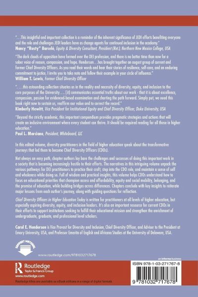 Part 1: Pathway and Purpose 1. Wouldn't Take Nothing for My Journey Now Sylvia Carey-Butler 2. Feeding my 'Superpower' or Embracing my Spirit R. Adidi Etim-Hunting 3. Negotiating Your Non-Negotiables Sonia J. Toson 4. The Journey, The Struggle, and The Progress Tamara A. Johnson Part 2: Impact and Transformation 5. Dialogue and 'DEI': Two Sides of the Same Coin of Justice Ed Lee III 6. A Framework for the Sustainability of WOC DEIA+ Practitioners: A Queen's Collective Alexis J. Stokes, Sherri H. Benn, Luz Janet Mejias, Angela N. Spranger, Caryn Reed-Hendon, J. Camille Hall, Ria DasGupta, and R. Adidi Etim-Hunting 7. The Extraordinary Power of Kindness: Reshaping Organizational Culture as a CDO Yves-Rose Porcena Part 3: Perfecting the Pivot 8. From Boardrooms to Breakthroughs: Perfecting the Pivot TaJuan R. Wilson 9. History of a CDO's Journey Over 50 Years Benjamin D. Reese, Jr. 10. Navigating Nepantla Carolyn J. Morales 11. Coda: We Can Build the World We Want to See: Reflections on the Roots, Branches, and Future of DEI Work Anneliese Singh