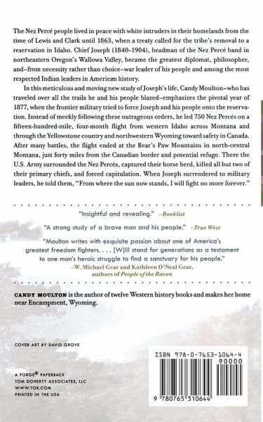 The Nez Percé people lived in peace with white intruders in their homelands from the time of Lewis & Clark until 1863 when a treaty called for the tribe's removal to a reservation in Idaho. Chief Joseph (1840-1904), headman of the Nez Percé band in northeastern Oregon's Wallowa Valley, became the greatest diplomat, philosopher, and-from necessity rather than choice-war leader of his people and among the most respected Indian leaders of American history. In this meticulous and moving new study of Joseph's life, Candy Moulton- who has traveled over all the trails he and his people blazed-emphasizes the pivotal year of 1877, when the frontier military tried to force Joseph and his people onto the reservation. Instead of meekly following these outrageous orders, he led 750 Nez Percés on a 1,500-mile, four-month flight from western Idaho across Montana and through the Yellowstone country and northwest Wyoming toward safety in Canada. After many battles, the flight ended at the Bear Paws mountains in north-central Montana, just forty miles from the Canadian border and potential refuge. There the U.S. Army surrounded the Nez Percés, captured their horse herd, killed all but two of their primary chiefs, and forced capitulation. When Joseph surrendered to military leaders he told them, "From where the sun now stands I will fight no more forever."