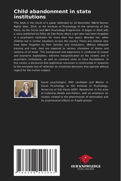 This book is the result of a paper defended on 10 December (World Human Rights Day), 2014, at the Institute of Psychology of the University of São Paulo, by the Social and Work Psychology Programme. It began in 2010 with a story published by Folha de São Paulo about a girl who had been forgotten in a psychiatric institution for more than four years. Besides her, other children live in similar situations across the country. These are children who have been forgotten by their families and institutions. Without adequate training and care, they are exposed to various situations of abuse and violence of all kinds. This background and experience is conducive to sexual and economic exploitation, extreme marginalisation on the streets and in psychiatric institutions, as well as constant visits to Casa Foundations. In this sense, a discourse that legitimises exclusion is constructed in response to the complete lack of reflection on trivialised decisions that operate without regard for thehuman subject.