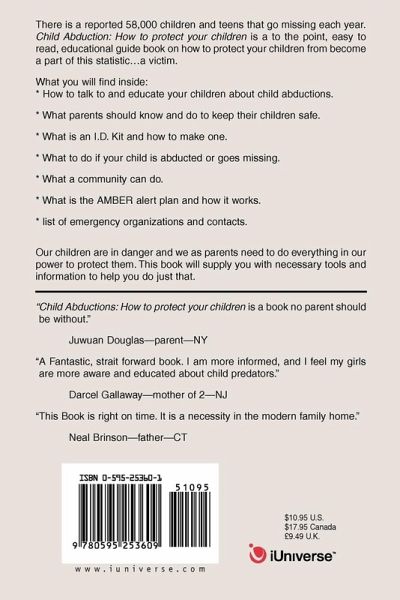 There is a reported 58,000 children and teens that go missing each year. "Child Abductions: How to protect your children" is a to the point, easy to read, educational guide book on how to protect your children from become a part of this statistic...a victim. What you will find inside: * How to talk to and educate your children about child abductions. * What parents should know and do to keep their children safe. * What is an I.D. Kit and how to make one. * What to do if your child is abducted or goes missing. * What a community can do. * What is the AMBER alert plan and how it works. * list of emergency organizations and contacts. Our children are in danger and we as parents need to do everything in our power to protect them. This book will supply you with necessary tools and information to help you do just that. ---------------------------------------- "Child Abductions:How to protect your children" is a book no parent should be without. Juwuan Douglas -parent- NY A Fantastic, strait forward book. I am more informed, and I feel my girls are are more aware and educated about child predators. Darcel Gallaway -mother of 2- NJ This Book is right on time. It is a necessity in the modern family home. Neal Brinson -father- CT CHILD ABDUCTIONS How to protect your children
