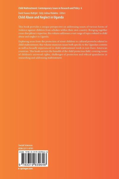 Foreword; Lola Adedokun.- Chapter 1. Introduction; David Kaawa-Mafigiri and Eddy J. Walakira.- Part I. Research and Theory.- Chapter 2. Building Research Evidence and Collaborative Partnerships in Uganda to Prevent and Protect Children Against Violence: Concerns and Priorities for Action; Eddy J. Walakira, Daniel Kikulwe, Ronald Luwangula, David Kaawa-Mafigiri and Badru Bukenya.- Chapter 3. "Situated" Understandings of Child Abuse and Maltreatment in Uganda; Gloria Kimuli Seruwagi.- Chapter 4. Proverbs and Child Protection: A Case Study of Three Bantu Languages: Luganda, Lusoga and Lunyankole; Paul Bukuluki, Aloysious Nyombi, Jude T. Rwemisisi, Ronald Luwangula, Ronard Mukuye, David Kaawa-Mafigiri and Ismael Ddumba-Nyanzi.- Chapter 5. Child Maltreatment in the Ugandan Print Media: A Discourse Analysis; Denis Muhangi.- Part II. Community and Child Protection.- Chapter 6. Children and Domestic Water Collection in Uganda: Exploring Policy and Intervention Options that Promote Child Protection; Firminus Mugumya, Richard B. Asaba, Innocent R. Kamya and Narathius Asingwire.- Chapter 7. Matriarchy in Patriarchal Societies: Burden of Care of Maternal Relatives and Vulnerability of Orphans from HIV Affected Households in Luwero District Uganda; Paul Bukuluki, David Kaawa-Mafigiri and Jude T. Rwemisisi.- Part III. Culturally Specific Forms of Child Maltreatment.- Chapter 8. The Female Genital Mutilation Economy and the Rights of the Girl Child to Education and Reproductive Health; Eric Awich Ochen, Laban Musinguzi, Esther Nanfuka Kalule, Eugene Gerald Ssemakula, Rebecca Kukundakwe, Chris C. Opesen and Paul Bukuluki.- Chapter 9. Dilemmas of Child "Sacrifice" and Mutilation in Uganda; Paul Bukuluki, Simon Fellows and Ronald Luwangula.- Chapter 10. Perpetrators or Protectors Against Violence? Police Officers in Uganda and Their Encounters with Children in Street Situations; Innocent R. Kamya and Eddy J. Walakira.- Part IV. Child Rights and Justice for Children.- Chapter 11. Negotiating Restorative and Retributive Justice in Access to Justice for Survivors of SGBV in Post-Conflict Northern Uganda; Paul Bukuluki, Ismael Ddumba-Nyanzi, John David Kisuule, Berit Schei and Johanne Sundby.- Chapter 12. Human Rights Abuse and Deprivation of Childhood: A Case of Girl Mothers in Northern Uganda; Sarah Kamya.- Part V. Responses to Child Maltreatment.- Chapter 13. System Strengthening to Improve Alternative Care for Neglected and Child Survivors of Violence: Critical Areas for Consideration; Eddy J. Walakira, Daniel Kikulwe, Ronald Luwangula, Mark Riley, Badru Bukenya and, Ismael Ddumba-Nyanzi and David Kaawa-Mafigiri.- Chapter 14. Does Child Rights Legislation and Policies Effectively Protect Children from Maltreatment? Evidence from a Nationwide Sectoral In-Depth Analysis; Eric Awich Ochen, John Ssengendo and Elinor W. Chemonges.- Chapter 15. Education for All: Reflections on the Schooling Status for the Girl Child in Uganda; Daniel Kikulwe, Eddy J.Walakira, Lyne Ssebikindu, Joy Ssebikindu, Denis Muhangi and Fred Matovu.- Chapter 16. Preparing Older Street Children for Successful Adult Life in Uganda: The Need to Prioritize Tailor-Made Skills Training Program in Uganda; Ronald Luwangula.