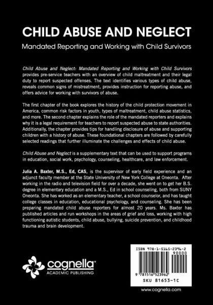 Child Abuse and Neglect: Mandated Reporting and Working with Child Survivors provides pre-service teachers with an overview of child maltreatment and their legal duty to report suspected offenses. The text identifies various types of child abuse, reveals common signs of mistreatment, provides instruction for reporting abuse, and offers advice for working with survivors of abuse. The first chapter of the book explores the history of the child protection movement in America, common risk factors in youth, types of maltreatment, child abuse statistics, and more. The second chapter explains the role of the mandated reporters and explains why it is a legal requirement for teachers to report suspected abuse to state authorities. Additionally, the chapter provides tips for handling disclosure of abuse and supporting children with a history of abuse. These foundational chapters are followed by carefully selected readings that further illuminate the challenges and effects of child abuse. Child Abuse and Neglect is a supplementary text that can be used to support programs in education, social work, psychology, counseling, healthcare, and law enforcement. Julia A. Baxter, M.S., Ed, CAS, is the supervisor of early field experience and an adjunct faculty member at the State University of New York College at Oneonta. After working in the radio and television field for over a decade, she went on to get her B.S. degree in elementary education and a M.S., Ed in school counseling, both from SUNY Oneonta. She has worked as an elementary teacher, a school counselor, and has taught college classes in education, educational psychology, and counseling. She has been preparing mandated child abuse reporters for almost 20 years. Ms. Baxter has published articles and run workshops in the areas of grief and loss, working with high functioning autistic students, child abuse, bullying, suicide prevention, and childhood trauma and brain development.