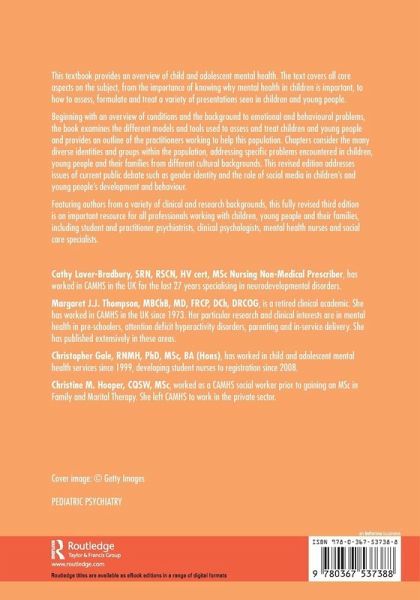 PART I: AN INTRODUCTION TO CHILDREN AND YOUNG PEOPLE'S MENTAL HEALTH; 1. A BRIEF HISTORY OF CHILD AND ADOLESCENT MENTAL HEALTH SERVICES (CAMHS) TO THE PRESENT DAY; 2. THE CONCEPTUAL BASIS OF MENTAL HEALTH PRACTICE; 3. MEDICO-LEGAL FRAMEWORKS IN MAKING TREATMENT DECISIONS WITH CHILDREN AND YOUNG PEOPLE; 4. SAFEGUARDING WITHIN CHILD AND ADOLESCENT MENTAL HEALTH SERVICES; 5. POLICY AND PRACTICE IN CHILDREN AND YOUNG PEOPLE'S MENTAL HEALTH; 6. COMMISSIONING SERVICES; PART II: THE PHYSICAL AND PSYCHOLOGICAL DEVELOPMENT OF CHILDREN AND YOUNG PEOPLE; 7. ATTACHMENT THEORY; 8. PIAGET'S STAGES OF COGNITIVE DEVELOPMENT AND ERIKSON'S STAGES OF PSYCHOSOCIAL DEVELOPMENT; 9. EMOTION PROCESSING IN CHILD AND ADOLESCENT PSYCHOPATHOLOGY; 10. EMOTIONAL LITERACY IN THE EDUCATION CONTEXT; 11. ASSESSING PAEDIATRIC DEVELOPMENT IN PSYCHIATRY; 12. GENETICS; 13. COGNITIVE ASSESSMENT IN CHILDREN AND YOUNG PEOPLE; 14. MENTAL HEALTH AND BEHAVIOURAL ISSUES IN CHILDREN AND YOUNG PEOPLE WITH A LEARNING DISABILITY; 15. SPEECH AND LANGUAGE DISORDERS;16. FEEDING/EATING PROBLEMS IN YOUNG CHILDREN; 17. CONSTIPATION AND SOILING; 18. ENURESIS; 19. BEHAVIOURAL SLEEP PROBLEMS IN CHILDREN AND ADOLESCENTS; 20. EPILEPSY; 21. CHRONIC HEALTH CONDITIONS AND MENTAL WELL-BEING IN CHILDREN AND YOUNG PEOPLE; 22. SEXUAL ORIENTATION; 23. GENDER DYSPHORIA IN CHILDREN AND YOUNG PEOPLE; 24. CULTURAL COMPETENCE IN WORKING WITH CHILDREN, YOUNG PEOPLE AND FAMILIES; 25. YOUNG CARERS; 26. YOUNG CARERS FROM BLACK ASIAN MINORITY ETHNIC (BAME) COMMUNITIES; PART III: TRAUMA; 27. MANAGING GRIEF, LOSS AND BEREAVEMENT; 28. DEVELOPMENTAL TRAUMA; 29. THE EFFECT OF CHILDHOOD MALTREATMENT ON BRAIN DEVELOPMENT; 30. ASYLUM SEEKERS, REFUGEES AND HOMELESS YOUNG PEOPLE; 31. POST-TRAUMATIC STRESS DISORDER (PTSD); PART IV: THE ASSESSMENT OF CHILDREN AND YOUNG PEOPLE'S MENTAL HEALTH; 32. MAKING SENSE OF BEHAVIOUR; 33. CHILD AND ADOLESCENT MENTAL HEALTH ASSESSMENT; 34. GENOGRAMS; 35. FAMILY ASSESSMENT; 36. PARENTING STYLES AND FAMILY SCRIPTS; 37. TRANSITION; PART V: MENTAL HEALTH ISSUES PRESENTING IN CHILDREN AND YOUNG PEOPLE; INTRODUCTION TO SECTION FIVE; 38. EPIDEMIOLOGY: SUMMARY OF MENTAL HEALTH OF CHILDREN AND YOUNG PEOPLE IN ENGLAND (2017); 39. AUTISTIC SPECTRUM CONDITIONS; 40. ATTENTION DEFICIT HYPERACTIVITY DISORDER; 41. JUVENILE DISRUPTIVE BEHAVIOUR DISORDERS: OPPOSITIONAL DEFIANT DISORDER (ODD) AND CONDUCT DISORDER (CD); 42. TIC DISORDERS AND TOURETTE SYNDROME; 43. DEPRESSION IN CHILDREN AND YOUNG PEOPLE; 44. BIPOLAR DISORDER IN CHILDREN AND YOUNG PEOPL; 45. FEAR AND ANXIETY; 46. OCD AND RELATED DISORDERS; 47. PSYCHOSIS IN CHILDREN AND YOUNG PEOPLE; 48. EATING DISORDERS; 49. SOMATOFORM AND RELATED DISORDERS IN CHILDREN AND YOUNG PEOPLE; 50. CHRONIC FATIGUE SYNDROME/ MYALGIC ENCEPHALOMYELITIS IN CHILDREN AND YOUNG PEOPLE; 51. SCHOOL ATTENDANCE PROBLEMS; 52. ADDICTIONS; 53. SCREEN-BASED ACTIVITIES AND SOCIAL MEDIA; 54. SELF-HARM AND SUICIDE; PART VI: THERAPEUTIC APPROACHES TO WORKING WITH CHILDREN, YOUNG PEOPLE AND THEIR FAMILIES; 55. GENERAL PRINCIPLES OF CLINICAL PSYCHOPHARMACOLOGY IN CHILDREN AND ADOLESCENTS: A PRACTICAL GUIDE; 56. CREATIVE THERAPIES (ART AND PLAY); 57. CHILD AND ADOLESCENT PSYCHOTHERAPY; 58. COUNSELLING CHILDREN AND YOUNG PEOPLE; 59. COGNITIVE BEHAVIOUR THERAPY; 60. COGNITIVE ANALYTIC THERAPY (CAT); 61. DIALECTICAL BEHAVIORAL THERAPY; 62. THEORY AND PRACTICE OF BEHAVIOUR MODIFICATION; 63. SOCIAL STORIES(TM); 64. FAMILY THERAPY MODELS AND PRACTICE; 65. BRIEF SOLUTION-FOCUSSED THERAPY; 66. NARRATIVE THERAPY; 67. THE OPEN DIALOGUE APPROACH; 68. THE GROUP PROCESS; 69. THEORETICAL UNDERPINNINGS OF PARENT-LED INTERVENTIONS TO TREAT PSYCHOPATHOLOGY IN CHILDREN; 70. PARENTING PROGRAMMES; PART VII: MAKING SENSE OF AVAILABLE SERVICES; 71. EARLY ACCESS: SELF HELP FOR CHILDREN, YOUNG PEOPLE AND FAMILIES WITH MENTAL HEALTH DIFFICULTIES; 72. EARLY ACCESS: FEEL THE FEAR AND DO IT ANYWAY: SETTING UP A VOLUNTEER SUPPORT GROUP; 73. EARLY ACCESS: OVERVIEW OF THIRD-SECTOR SUPPORT FOR CHILDREN, YOUNG PEOPLE AND THEIR FAMILIES; 74. EARLY ACCESS: HEALTH VISITING SERVICE; 75. EARLY ACCESS: FAMILY NURSE PARTNERSHIP: A SOUTHAMPTON MODEL; 76. EARLY ACCESS: PRIMARY MENTAL HEALTH IN THE COMMUNITY; 77. EARLY ACCESS: THE DEVELOPMENT AND PRACTICE OF ELSA; 78. EARLY ACCESS: EMOTIONAL LITERACY AND FIRST AID IN SCHOOLS; 79. EARLY ACCESS: A CAMHS' SINGLE POINT OF ACCESS: NOTTINGHAM CITY'S WHOLE SYSTEM MODEL; 80. SPECIALIST SERVICES: CHILD AND ADOLESCENT MENTAL HEALTH SERVICES (CAMHS); 81. SPECIALIST SERVICES: FORENSIC CHILD AND ADOLESCENT PSYCHIATRY; 82. BUILDING RESILIENCE AND STRENGTHS (BRS); 83. SPECIALIST SERVICES: SECURE ADOLESCENT INPATIENT; 84. SPECIALIST SERVICES: ACUTE INPATIENT; 85. SPECIALIST SERVICES: AN INPATIENT UNIT FOR CHILDREN WITH COMPLEX HEALTH NEEDS; 86. SPECIALIST SERVICES: ROLE OF THE EDUCATIONAL PSYCHOLOGIST; 87. SPECIALIST SERVICES: EDUCATION FOR CHILDREN WITH AUTISM SPECTRUM DISORERS AND SOCIAL STORIES FOR PARENTS OF AUTISTIC CHILDREN; 88. SPECIALIST SERVICES: WORKING WITH CHILDREN IN CARE AND RESIDENTIAL SCHOOLS (A WHOLE SERVICE/SYSTEMS APPROACH TO EMOTION-REGULATION); 89. SOCIAL CARE PROVISION FOR CHILDREN AND FAMILIES IN CAMHS: THE IMPORTANCE OF THE ROLE OF A SOCIAL WORKER WITHIN CAMHS TEAMS ...WITHOUT BECOMING A THERAPIST