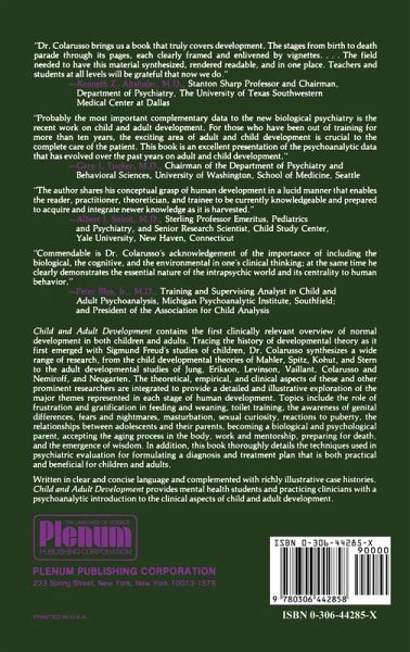 Developmental theory is the essence of any psychodynamic psychother apy, and certainly of psychoanalysis. It is through an understanding of progressive life events, and the way these events relate to associated biological and social events, that we come to understand both psycho pathology and psychological strengths. For a long time we have needed a clinically oriented book that surveys normal development in both childhood and adulthood. This book should be particularly helpful to all mental health professionals whose daily work requires a constant awareness and appraisal of devel opmental issues. Dr. Colarusso has integrated and summarized a tremen dous amount of theoretical, empirical, and clinical material in a format that makes it come alive through clinical examples. This book should be of great interest to all students of human behav ior as well as to seasoned clinicians. SHERWYN M. WOODS, M. D. , PH. D. vii Preface Each year as I gave a lecture series on child and adult development to the adult and child psychiatric residents at the University of California at San Diego, someone inevitably would ask, "Is there a book that I could understand that has all of this information in it?" I would reply that I did not know of any single source, but I could refer the person to many articles and books on development.