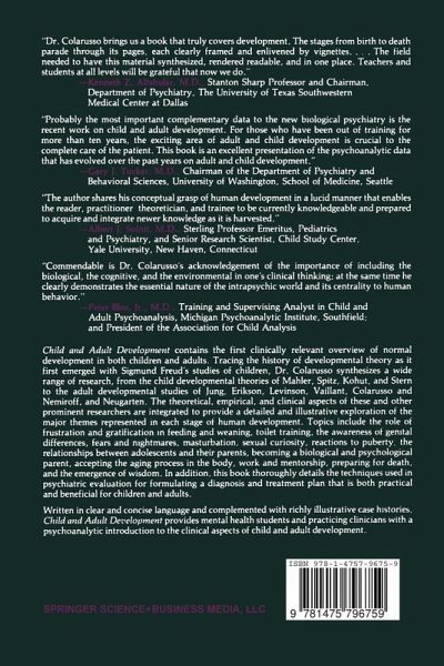 Developmental theory is the essence of any psychodynamic psychother apy, and certainly of psychoanalysis. It is through an understanding of progressive life events, and the way these events relate to associated biological and social events, that we come to understand both psycho pathology and psychological strengths. For a long time we have needed a clinically oriented book that surveys normal development in both childhood and adulthood. This book should be particularly helpful to all mental health professionals whose daily work requires a constant awareness and appraisal of devel opmental issues. Dr. Colarusso has integrated and summarized a tremen dous amount of theoretical, empirical, and clinical material in a format that makes it come alive through clinical examples. This book should be of great interest to all students of human behav ior as well as to seasoned clinicians. SHERWYN M. WOODS, M. D. , PH. D. vii Preface Each year as I gave a lecture series on child and adult development to the adult and child psychiatric residents at the University of California at San Diego, someone inevitably would ask, "Is there a book that I could understand that has all of this information in it?" I would reply that I did not know of any single source, but I could refer the person to many articles and books on development.