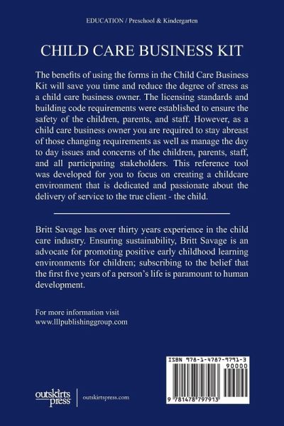 The benefits of using the forms in the Child Care Business Kit will save you time and reduce the degree of stress as a child care business owner. The licensing standards and building code requirements were established to ensure the safety of the children, parents, and staff. However, as a child care business owner you are required to stay abreast of those changing requirements as well as manage the day to day issues and concerns of the children, parents, staff, and all participating stakeholders. This reference tool was developed for you to focus on creating a childcare environment that is dedicated and passionate about the delivery of service to the true client - the child.