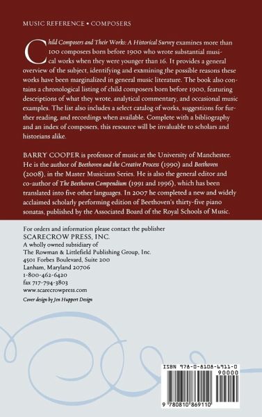 In Child Composers and Their Works: A Historical Survey, Barry Cooper examines over 100 composers born before 1900 who wrote substantial musical works before age 16. The book provides a general overview of the subject, examining the ways and identifying possible reasons these works have been marginalized in the general literature. The book also contains an annotated checklist of over 100 notable child composers, presenting a valuable and handy reference of these creators and their early works. The annotated checklist presents a chronological listing of child composers born before 1900 and features a descriptive list of what they wrote, often including analytical commentary and offering occasional music examples for illustration. The list also includes a select catalog of works, suggestions for further reading, and recordings when available. Complete with a bibliography and an index of composers, this resource is invaluable to scholars and historians.