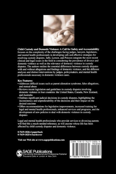Child Custody and Domestic Violence: A Call for Safety and Accountability focuses on the complexity of the challenges facing judges, lawyers, legislators, and mental health professionals in developing safe and effective strategies for resolving custody disputes. Jaffe, Lemon, and Poisson integrate the most recent clinical and legal issues in the field in considering the prevalence of divorce and domestic violence as well as the relevance of domestic violence in custody disputes. The authors outline the essential differences between custody disputes with and without allegations and findings of domestic violence, and the different analysis and distinct interventions by judges, policymakers, and mental health professionals necessary in domestic violence cases.