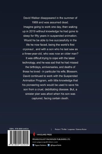 David Walker disappeared in the summer of 1969 and was assumed dead. Imagine going to work one day, then waking up in 2019 without knowledge he had gone to sleep for fifty years in suspended animation. Would he be able to live successfully in the life he now faced, being the world's first cryonaut , and with a son who he last saw as a three-year-old, who was now an older man? It was difficult trying to cope with the latest technology, and he was sad that he had missed the birthdays, anniversaries, and deaths of those he loved - in particular his wife, Blossom. David continued to work with the Suspended Animation Program, with little knowledge that his pioneering work would be used to save his son from a cruel, debilitating disease. But, a sinister plan was afoot when his son was captured, facing certain death.