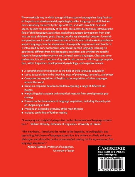 The remarkable way in which young children acquire language has long fascinated linguists and developmental psychologists alike. Language is a skill that we have essentially mastered by the age of three, and with incredible ease and speed, despite the complexity of the task. This accessible textbook introduces the field of child language acquisition, exploring language development from birth. Setting out the key theoretical debates, it considers questions such as what characteristics of the human mind make it possible to acquire language; how far acquisition is biologically programmed and how far it is influenced by our environment; what makes second language learning (in adulthood) different from first language acquisition; and whether the specific stages in language development are universal across languages. Clear and comprehensive, it is set to become a key text for all courses in child language acquisition, within linguistics, developmental psychology and cognitive science.