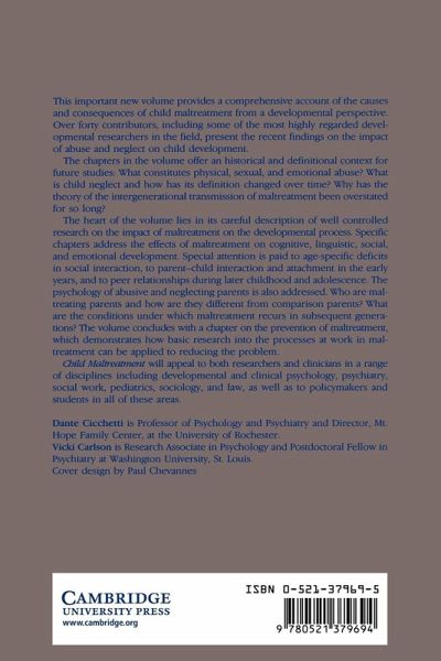 Preface; Part I. History And Denfinition: 1. Definitional issues in child maltreatment; 2. Physical child abuse in America: past, present, and future; 3. Pediatrics and child abuse; 4. Sexual abuse of children: causes and consequences; 5. The intergenerational transmission of child abuse; Part II. Parental And Contextual Influences On Maltreatment: 6. Lessons from child abuse: the determinants of parenting; 7. The antecedents of maltreatment: results of the Mother-Child Interaction Research Project; 8. Parental attributions as moderators of affective communication to children at risk for physical abuse; 9. Perceived similarities and disagreements about childrearing practices in abusive and nonabusive families; 10. Cognitive foundations for parental care; 11. Intergenerational continuities and discontinuities in serious parenting difficulties; 12. The construct of empathy and the phenomenon of physical maltreatment of children; Part III. The Developmental Consequences Of Child Maltreatment: 13. How research on child maltreatment has informed the study of child development: perspectives from developmental psychopathology; 14. Child maltreatment and attachment theory; 15. Patterns of maternal behaviour among infants at risk for abuse: relations with infant attachment behaviour and infant development at 12 months of age; 16. Finding order in disorganization: lessons from research on maltreated infants' attachments to their caregivers; 17. Peer relations in maltreated children; 18. The effects of maltreatment on development during early childhood: recent studies and their theoretical, clinical and policy implications; 19. Social cognition in maltreated children; 20. The effects of maltreatment on the development of young children; 21. Troubled youth, troubled families: the dynamics of adolescent maltreatment; 22. Child abuse, delinquency, and violent criminality; 23. The prevention of maltreatment; Name index; Subject index.