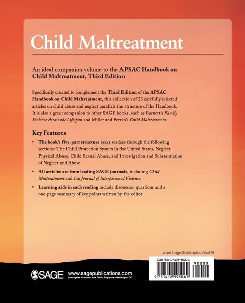 Specifically created to complement the Third Edition of the APSAC Handbook on Child Maltreatment, this collection of 23 carefully selected articles on child abuse and neglect parallels the structure of the Handbook. It is also a great companion to other Sage books, such as Barnett's Family Violence Across the Lifespan and Miller and Perrin's Child Maltreatment.