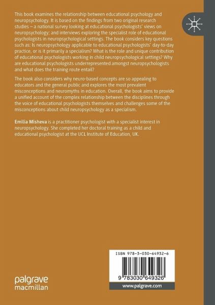 This book examines the relationship between educational psychology and neuropsychology. It is based on the findings from two original research studies - a national survey looking at educational psychologists' views on neuropsychology; and interviews exploring the specialist role of educational psychologists in neuropsychological settings. The book considers key questions such as: Is neuropsychology applicable to educational psychologists' day-to-day practice, or is it primarily a specialism? What is the role and unique contribution of educational psychologists working in child neuropsychological settings? Why are educational psychologists underrepresented amongst neuropsychologists and what does the training route entail?