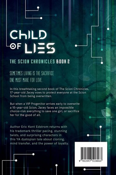 Sometimes living is the sacrifice one must make for love. In this breathtaking second book of The Scion Chronicles, 17 year old Jacey vows to protect everyone at the Scion School from being overwritten. But when a VIP Progenitor arrives early to overwrite a 15 year old Scion, Jacey faces an impossible choice--risk everything to save her or to sacrifice her for the good of all. Author Eric Kent Edstrom returns with his trademark thriller pacing, stunning twists, and surprising characters in this YA dystopian tale about cloning, mind transfer, and the power of loyalty. Buy your copy today!