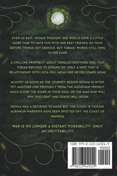 Even as bait, Neoma thought she would have a little more time to have fun with her best friends on Tour before things got serious. But Tobias' words still ring in her ears. A chilling prophecy about tangled destinies. One that Tobias refused to expand on. Only a hint that a relationship with Luca will mean she never comes home. Almost as soon as the journey begins Neoma is given yet another dire prophecy from the Mountain Herself: hold close the stars in your soul or the Mad God will win this fight and chaos will reign. Neoma has a decision to make but the clock is ticking. Aurinkun warships have been spotted off the coast of Manena. War is no longer a distant possibility. Only an inevitability.