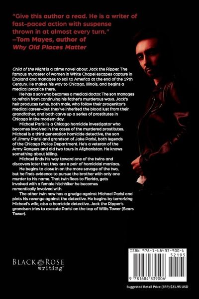 "Child of the Night is an interesting exploration of not only Jack the Ripper, but the idea of nature vs nurture. I very much enjoyed all the twists and turns of the book and it was definitely that creepy kind of good that will be a great re-read around Halloween." -LibraryThing Early Reviewers Child of the Night is a crime novel about Jack the Ripper. The famous murderer of women in White Chapel escapes capture in England and manages to sail to America at the end of the 19th Century. He makes his way to Chicago, Illinois, and begins a medical practice there. He has a son who becomes a medical doctor. The son manages to refrain from continuing his father's murderous ways. Jack's heir produces twins, both male, who follow their progenitor's medical career-but they've inherited the blood lust from their grandfather, and both carve up a series of prostitutes in Chicago in the modern day. Michael Parisi is a Chicago homicide investigator who becomes involved in the cases of the murdered prostitutes. Michael is a third generation homicide detective, the son of Jimmy Parisi and grandson of Jake Parisi, both legends of the Chicago Police Department. He's a veteran of the Army Rangers and did two tours in Afghanistan. He knows something about killing. Michael finds his way toward one of the twins and discovers later that they are a pair of homicidal maniacs. He begins to close in on the more savage of the two, but he finds evidence to pursue the brother with only one murder to his name. That twin flees to Florida, gets involved with a female hitchhiker he becomes romantically involved with. The other twin now has a grudge against Michael Parisi and plots his revenge against the detective. He begins by terrorizing Michael's wife, also a homicide detective. Jack the Ripper's grandson tries to execute Parisi on the top of Willis Tower (Sears Tower).
