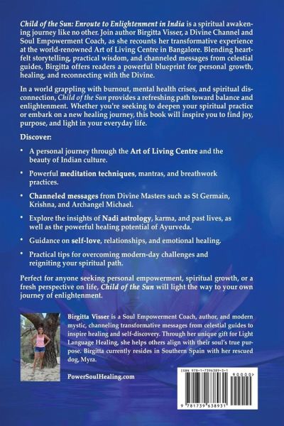 In Child of the Sun: Enroute to Enlightenment in India, author Birgitta Visser invites you on an extraordinary spiritual journey. As a Divine Channel and Soul Empowerment Coach, Birgitta recounts her profound experiences at the Art of Living Centre in Bangalore, offering readers transformative insights into meditation, self-love, and divine healing. In a world filled with stress, burnout, and spiritual disconnection, this book serves as a beacon of light. Birgitta's teachings guide you through powerful meditation techniques, mantras, and breathwork practices designed to heal emotional wounds and awaken your spiritual path. Through channeled messages from Divine Masters like Krishna, St Germain, and Archangel Michael, you'll discover the keys to overcoming life's challenges and reconnecting with the Divine within. Perfect for anyone seeking to reignite their spiritual practice, Child of the Sun provides practical wisdom on self-love, emotional healing, and personal growth. This book is an essential companion for those looking to live a more fulfilled and enlightened life. Uncover: - A personal spiritual awakening at the Art of Living Centre in India - Meditation, mantra, and breathwork practices for healing and enlightenment - Channeled messages from Divine Masters - Insights on past lives, karma, Nadi astrology and Ayurveda - A guide to overcoming modern-day challenges and finding balance - Relationships and the journey to self-love Begin your journey of spiritual growth and healing today with Child of the Sun. Reignite your purpose and find peace on your path to enlightenment.