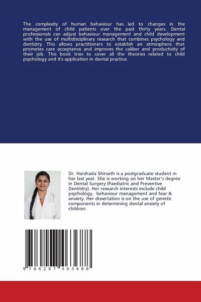 The complexity of human behaviour has led to changes in the management of child patients over the past thirty years. Dental professionals can adjust behaviour management and child development with the use of multidisciplinary research that combines psychology and dentistry. This allows practitioners to establish an atmosphere that promotes care acceptance and improves the caliber and productivity of their job. This book tries to cover all the theories related to child psychology and it's application in dental practice.
