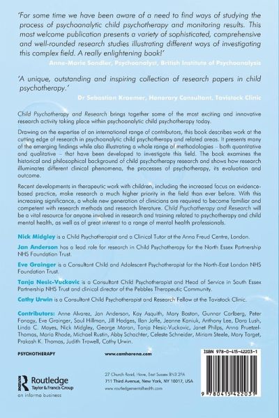 Hobson Preface. Urwin Anderson Grainger Midgley Nesic-Vuckovic Introduction. Part I: What is Child Psychotherapy Research? Editor's Introduction. Fonagy Research in Child Psychotherapy: Progress Problems and Possibilities? Rustin What Do Child Psychotherapists Know? Part II: Studying the Process of Child Psychotherapy. Editor's Introduction. Philps Mapping Process in Child Psychotherapy: Steps Towards Drafting a New Method for Evaluating Psychoanalytic Case Studies. Schneider Pruetzel-Thomas Midgley Discovering New Ways of Seeing and Speaking About Psychotherapy Process: The Child Psychotherapy Q-set. Moran Fonagy Psychoanalysis and Diabetic Control: A Single-case Study. Carlberg Exploring Change Processes in Psychodynamic Child Psychotherapy: The Therapists' Perspective. Part III: The Routine Monitoring and Outcome of Child Psychotherapy. Editor's Introduction. Boston Lush Grainger Evaluation of Psychoanalytic Psychotherapy with Fostered Adopted and 'In Care' Children. Trowell Rhode Joffe Childhood Depression: An Outcome Research Project. Schacter Target The Adult Outcome of Child Psychoanalysis: The Anna Freud Centre Long-term Follow-up Study. Urwin A Qualitative Framework for Evaluating Clinical Effectiveness in Child Psychotherapy: The Hopes and Expectations for Treatment Approach (HETA). Part IV: Inter-disciplinary Research. Editor's Introduction. Alvarez Lee Interpersonal Relatedness in Children With Autism: Clinical Complexity versus Scientific Simplicity? Anderson The Mythic Significance of Risk-taking Dangerous Behaviour. Hodges Steele Kaniuk Hillman Asquith Narratives in Assessment and Research on the Development of Attachments in Maltreated Children. Mayes Thomas Social Neuroscience and Theories of Therapeutic Action: Some Implications for Child Psychotherapy.
