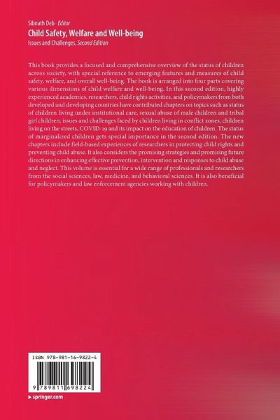This book provides a focused and comprehensive overview of the status of children across society, with special reference to emerging features and measures of child safety, welfare, and overall well-being. The book is arranged into four parts covering various dimensions of child welfare and well-being. In this second edition, highly experienced academics, researchers, child rights activities, and policymakers from both developed and developing countries have contributed chapters on topics such as status of children living under institutional care, sexual abuse of male children and tribal girl children, issues and challenges faced by children living in conflict zones, children living on the streets, COVID-19 and its impact on the education of children. The status of marginalized children gets special importance in the second edition. The new chapters include field-based experiences of researchers in protecting child rights and preventing child abuse. It also considers the promising strategies and promising future directions in enhancing effective prevention, intervention and responses to child abuse and neglect. This volume is essential for a wide range of professionals and researchers from the social sciences, law, medicine, and behavioral sciences. It is also beneficial for policymakers and law enforcement agencies working with children.