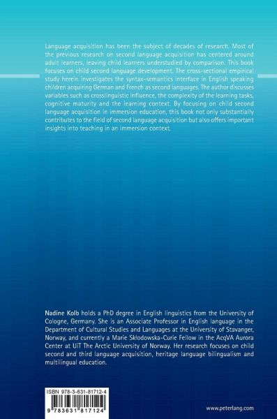 Language acquisition has been the subject of decades of research. Most of the previous research on second language acquisition has centered around adult learners, leaving child learners understudied by comparison. This book focuses on child second language development. The cross-sectional empirical study herein investigates the syntax-semantics interface in English speaking children acquiring German and French as second languages. The author discusses variables such as crosslinguistic influence, the complexity of the learning tasks, cognitive maturity and the learning context. By focusing on child second language acquisition in immersion education, this book not only substantially contributes to the field of second language acquisition but also offers important insights into teaching in an immersion context.
