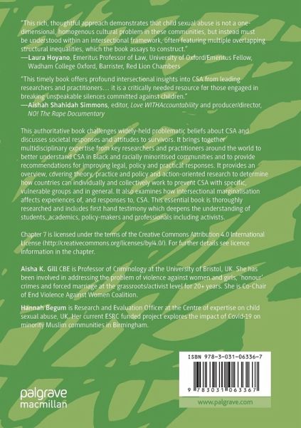 1. Introduction.- 2. Epistemic injustice: Racially marginalised adult survivors of child sexual abuse.- 3. Understanding the experiences of British South Asian male survivors of child sexual abuse.- 4. Maternal Mimesis: The impact of intersectional abuse on African-Caribbean British maternal responses to 'tellings' of child sexual abuse by daughters.- 5. 'Preserving what for whom?': Female victims' perspectives on the silence behind sexual abuse in Britain's South Asian communities.- 6. Survivors speak up: Improving police responses to sexual abuse cases in Black and racially minoritised communities.- 7. Institutional responses to child sexual abuse in ethnic minority communities.- 8. Addressing harmful sexual behaviours among children and young people: Definitional and regulatory tensions.- 9. He didn't want any of that: Considerations in the study and theorization of Black boys' sexual victimization in the United States.- 10. Child sexual abuse in Latinx populations in the United States: An examination of cultural influences.- 11. Truth, trauma and healing: Stories of Aboriginal survivors of child sexual abuse in out-of-home care.- 12. The blurred line: Balancing the treatment of personality disorders, personal trauma, and cultural trauma among individuals who have sexually offended.- 13. "Pussy power"? Reflecting on research practice with Aboriginal and/or Torres Strait Islander men who have offended sexually.
