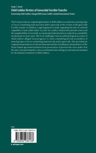 This book provides an original legal analysis of child soldiers recruited into armed groups or forces committing mass atrocities and/or genocide as the victims of the genocidal forcible transfer of children. Legal argument is made regarding the lack of criminal culpability of such child soldier 'recruits' for conflict-related international crimes and the inapplicability of currently recommended judicial and non-judicial accountability mechanisms in such cases. The book challenges various anthropological accounts of child soldiers' alleged 'tactical agency' to resist committing atrocity as members of armed groups or forces committing mass atrocity and/or genocide. Also provided are original interpretations of relevant international law including an interpretation of the Rome Statute age -based exclusion from prosecution of persons who were under 18 at the time of perpetrating the crime as substantive law setting an international standard for the humane treatment of child soldiers.