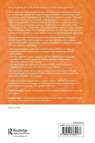 Childcare is a topic that is frequently in the media spotlight and continues to spark heated debate in the UK and around the world. This book presents an in-depth study of childcare policy and practice, examining middle class parents' choice of childcare within the wider contexts of social class and class fractions, social reproduction, gendered responsibilities and conceptions of 'good' parenting. Drawing on the results of a qualitative empirical study of two groups of middle class parents living in two London localities, this book: takes into account key theoretical frameworks in childcare policy, setting them in broader social, political and economic contexts considers the development of the UK government's childcare strategy from its birth in 1998 to the present day highlights the critical debates surrounding middle class families and their choice of childcare explores parents' experiences of childcare and their relationships with carers. This important study comes to a number of thought-provoking conclusions and offers valuable insights into a complex subject. It is essential reading for all those working in or studying early years provision and policy as well as students of sociology, class, gender and work.