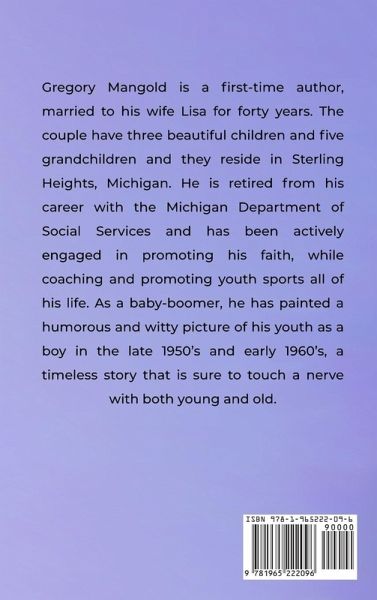 Gregory Mangold is a first-time author, married to his wife Lisa for forty years. The couple have three beautiful children and five grandchildren and they reside in Sterling Heights, Michigan. He is retired from his career with the Michigan Department of Social Services and has been actively engaged in promoting his faith, while coaching and promoting youth sports all of his life. As a baby-boomer, he has painted a humorous and witty picture of his youth as a boy in the late 1950's and early 1960's, a timeless story that is sure to touch a nerve with both young and old.