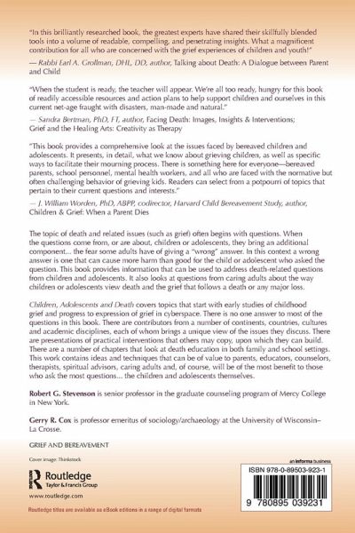 The topic of death and related issues (such as grief) often begin with questions. When the questions come from, or are about, children or adolescents, they bring an additional component...the fear some adults have of giving a "wrong" answer. In this context a wrong answer is one that can cause more harm than good for the child or adolescent who asked the question. This book provides information that can be used to address the death-related questions from children and adolescents. It also looks at questions from caring adults about the way children or adolescents view death and the grief that follows a death or any major loss. Children, Adolescents, and Death covers topics that start with early studies of childhood grief and progress to expression of grief in cyberspace. There is no one answer to most of the questions in this book. There are contributors from a number of continents, countries, cultures, and academic disciplines, each of whom brings a unique view of the topic issues they discuss. There are presentations of practical interventions that others may copy, upon which they can build. There are a number of chapters that look at death education in both family and school settings. This work contains ideas and techniques that can be of value to parents, educators, counselors, therapists, spiritual advisors, caring adults and, of course, will be of the most benefit to those who ask the most questions...the children and adolescents themselves.