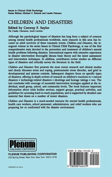 Introduction: Children and Disasters: Clinical and Research Issues.- 1. Stress and Coping in Children and Families: Implications for Children Coping with Disaster.- 2. Posttraumatic Stress Disorder in Children and Adolescents.- 3. Issues in the Assessment of Posttraumatic Stress Disorder in Children.- 4. Concepts of Death and Loss in Childhood and Adolescence: A Developmental Perspective.- 5. Impact of Natural Disasters on Children and Families.- 6. Technology-Related Disasters.- 7. Psychological Response of Children to Shootings and Hostage Situations.- 8. Children and War.- 9. Individual and Small-Group Psychotherapy for Children Involved in Trauma and Disaster.- 10. School-Based Intervention Following a Disaster.- 11. Community-Level Intervention after a Disaster.