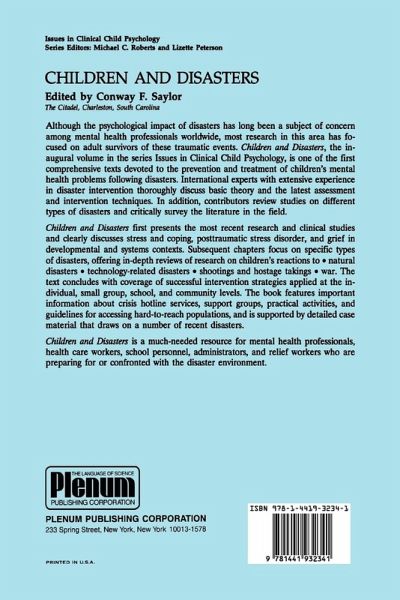 Introduction: Children and Disasters: Clinical and Research Issues.- 1. Stress and Coping in Children and Families: Implications for Children Coping with Disaster.- 2. Posttraumatic Stress Disorder in Children and Adolescents.- 3. Issues in the Assessment of Posttraumatic Stress Disorder in Children.- 4. Concepts of Death and Loss in Childhood and Adolescence: A Developmental Perspective.- 5. Impact of Natural Disasters on Children and Families.- 6. Technology-Related Disasters.- 7. Psychological Response of Children to Shootings and Hostage Situations.- 8. Children and War.- 9. Individual and Small-Group Psychotherapy for Children Involved in Trauma and Disaster.- 10. School-Based Intervention Following a Disaster.- 11. Community-Level Intervention after a Disaster.