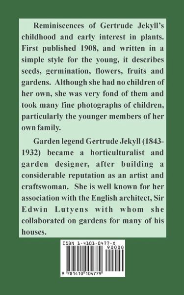 Reminiscences of Gertrude Jekyll's childhood and early interest in plants. First published 1908, and written in a simple style for the young, it describes seeds, germination, flowers, fruits and gardens. Although she had no children of her own, she was very fond of them and took many fine photographs of children, particularly the younger members of her own family. Garden legend Gertrude Jekyll (1843-1932) became a horticulturalist and garden designer, after building a considerable reputation as an artist and craftswoman. She is well known for her association with the English architect, Sir Edwin Lutyens with whom she collaborated on gardens for many of his houses.