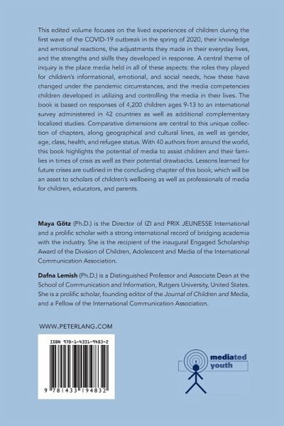 This edited volume focuses on the lived experiences of children during the first wave of the COVID-19 outbreak in the spring of 2020, their knowledge and emotional reactions, the adjustments they made in their everyday lives, and the strengths and skills they developed in response. A central theme of inquiry is the place media held in all of these aspects: the roles they played for children's informational, emotional, and social needs, how these have changed under the pandemic circumstances, and the media competencies children developed in utilizing and controlling the media in their lives. The book is based on responses of 4,200 children ages 9-13 to an international survey administered in 42 countries as well as additional complementaries localized studies. Comparative dimensions are central to this unique collection of chapters, along geographical and cultural lines, as well as gender, age, class, health, and refugee status. With 40 authors from around the world, this bookhighlights the potential of media to assist children and their families in times of crisis as well as their potential drawbacks. Lessons learned for future crises are outlined in the concluding chapter of this book, which will be an asset to scholars of children's wellbeing as well as professionals of media for children, educators, and parents.