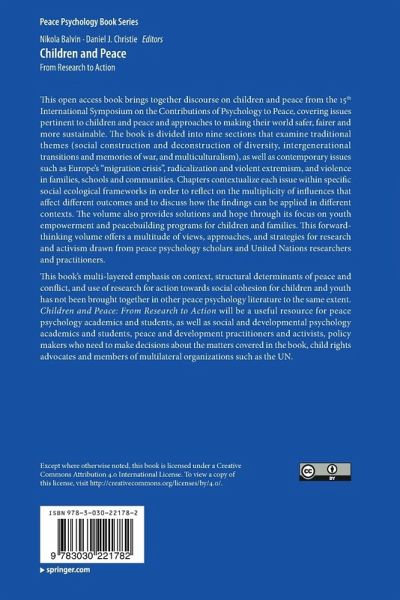 This open access book brings together discourse on children and peace from the 15th International Symposium on the Contributions of Psychology to Peace, covering issues pertinent to children and peace and approaches to making their world safer, fairer and more sustainable. The book is divided into nine sections that examine traditional themes (social construction and deconstruction of diversity, intergenerational transitions and memories of war, and multiculturalism), as well as contemporary issues such as Europe's "migration crisis", radicalization and violent extremism, and violence in families, schools and communities. Chapters contextualize each issue within specific social ecological frameworks in order to reflect on the multiplicity of influences that affect different outcomes and to discuss how the findings can be applied in different contexts. The volume also provides solutions and hope through its focus on youth empowerment and peacebuilding programs for children and families. This forward-thinking volume offers a multitude of views, approaches, and strategies for research and activism drawn from peace psychology scholars and United Nations researchers and practitioners.