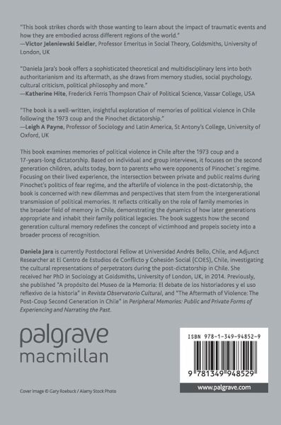 This book examines memories of political violence in Chile after the 1973 coup and a 17-years-long dictatorship. Based on individual and group interviews, it focuses on the second generation children, adults today, born to parents who were opponents of Pinochet´s regime. Focusing on their lived experience, the intersection between private and public realms during Pinochet's politics of fear regime, and the afterlife of violence in the post-dictatorship, the book is concerned with new dilemmas and perspectives that stem from the intergenerational transmission of political memories. It reflects critically on the role of family memories in the broader field of memory in Chile, demonstrating the dynamics of how later generations appropriate and inhabit their family political legacies. The book suggests how the second generation cultural memory redefines the concept of victimhood and propels society into a broader process of recognition.