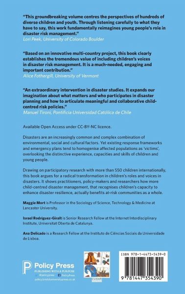 Available Open Access under CC-BY-NC licence. Disasters are an increasingly common and complex combination of environmental, social and cultural factors. Yet existing response frameworks and emergency plans tend to homogenise affected populations as 'victims', overlooking the distinctive experience, capacities and skills of children and young people. Drawing on participatory research with more than 550 children internationally, this book argues for a radical transformation in children's roles and voices in disasters. It shows practitioners, policy-makers and researchers how more child-centred disaster management, that recognises children's capacity to enhance disaster resilience, actually benefits at-risk communities as a whole.