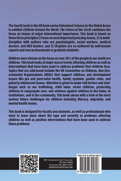 The fourth book in the UN book series Behavioral Science in the Global Arena is entitled Children Around the World: The Future of Our Earth continues the focus on issues of major international importance. This book is based on these three principles 1) Focus on most important pressing issues, 2) is multidiscipline with authors who are psychologists, social workers, medical doctors, and NGO leaders, and 3) Chapters are co-authored by well-known experts and new professionals or graduate students.Children were chosen as the focus as over 30% of the people in our world are children. This book looks at major macro trends affecting children as well as interventions that have been used to address problems that children face. Topics that are addressed include the UN Convention on Children, Non-Governmental Organizations (NGOs) that support children, and development issues like pre and post-natal health, family systems, gender roles, and puberty/adolescent issues. Attention is given to major risk factors and challenges such as sex trafficking, child labor, street children, protecting children in congregate care, and violence against children in the home, in institutions, and in the community. This book closes with a look at the most serious future challenges for children including literacy, migration, and mental health issues.This book is designed for faculty and students, as well as professionals who want to learn more about the type and severity of problems affecting children as well as positive interventions that have been used to address these problems.