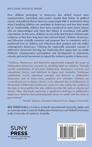 Looks at the present norms and practices of a new form of democratic education and children's democratic participation, utilizing both theoretical and empirical examination of children's deliberative agency. How children participate in democracy has shifted toward more communicative, networked, and creative models than before. In political science and political theory, however, surprisingly little is understood about what if anything children can contribute to democracy and how they would do so. Traditionally, children have been considered as mere future citizens who are acknowledged only when they behave in accordance with adults' expectations. In this sense, children are one of the last frontiers of democratic inclusion, as they have long been seen and not heard. Children, Democracy, and Education critically examines and proposes how to counteract such a traditional view on children and retheorizes their position and role within contemporary democracy. Utilizing the empirically grounded concept of deliberative democratic learning, Kei Nishiyama then argues how we enable children's communicative participation and development in classrooms, schools, and social movements to expand the inclusive quality of democracy.